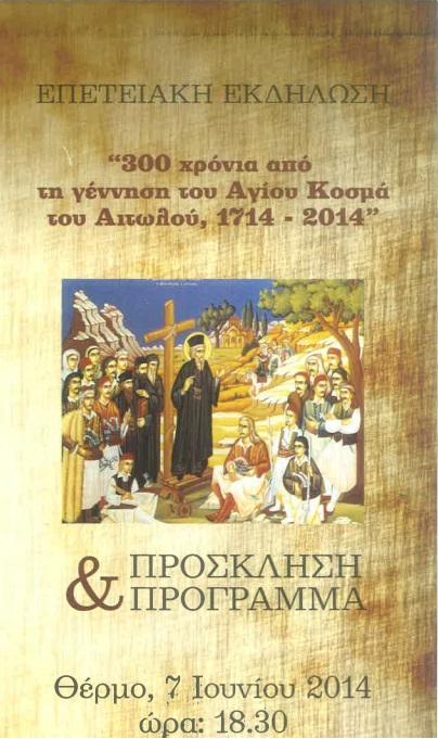 Στο Θέρμο, ιδιαίτερη πατρίδα του Αγίου των σκλάβων, του Πατροκοσμά, του Αγίου Κοσμά του Αιτωλού, οργανώθηκε απ΄ το Δημοτικό Σχολείο Θέρμου, Ημερίδα - Επετειακή Εκδήλωση επ΄ ευκαιρία της συμπλήρωσης 300 χρόνων απ΄ τη γέννηση του μεγάλου διδάχου μας Κοσμά του Αιτωλού, 1714 - 2014.